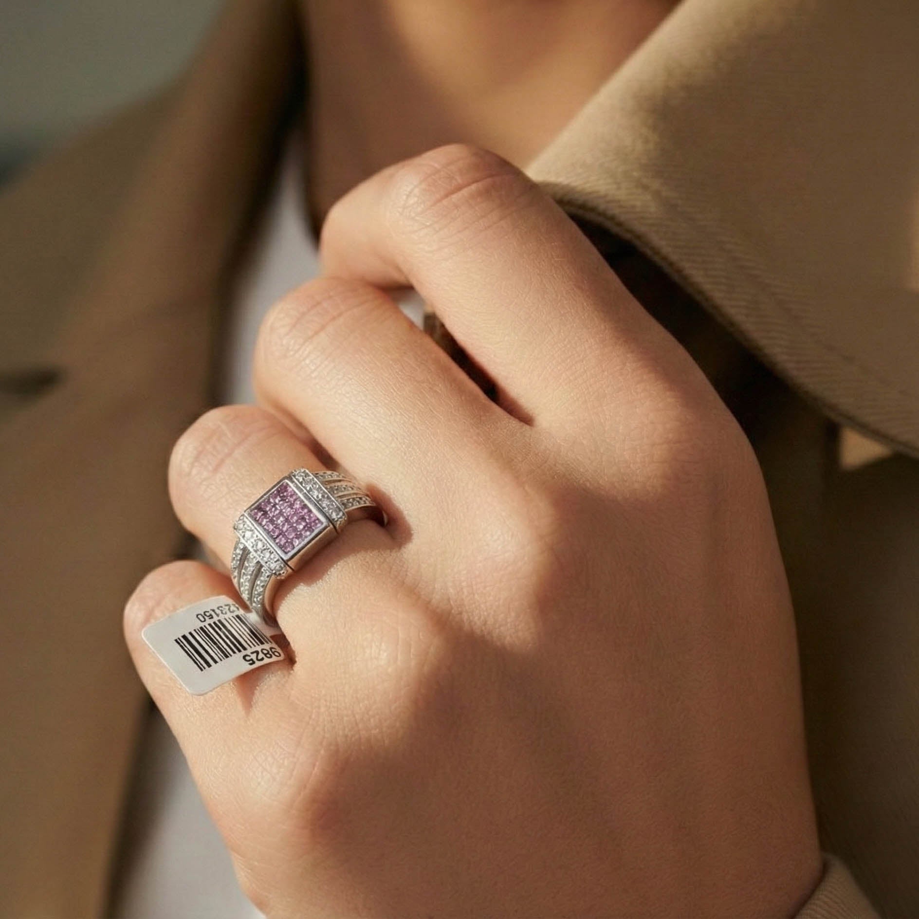 18kt white gold ladies reversible ring - worn two ways - diamonds, pink sapphires and rubies, 86pts (.86ct) in diamonds, 84pts (.84ct) in rubies, 43pts (.43ct) in pink sapphires - size 7