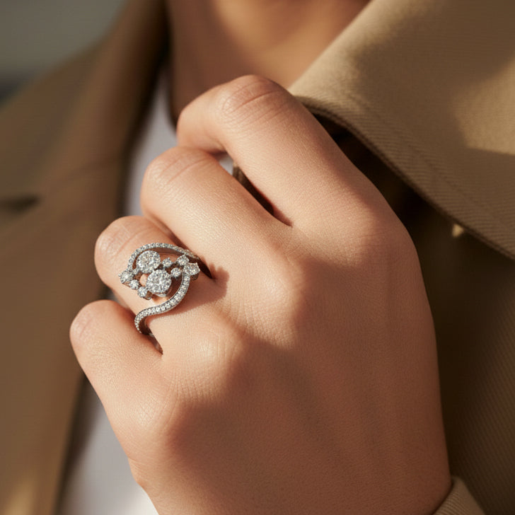 14kt white gold ladies fancy diamond ring - diamonds 58pts (.58ct) - size 6.5